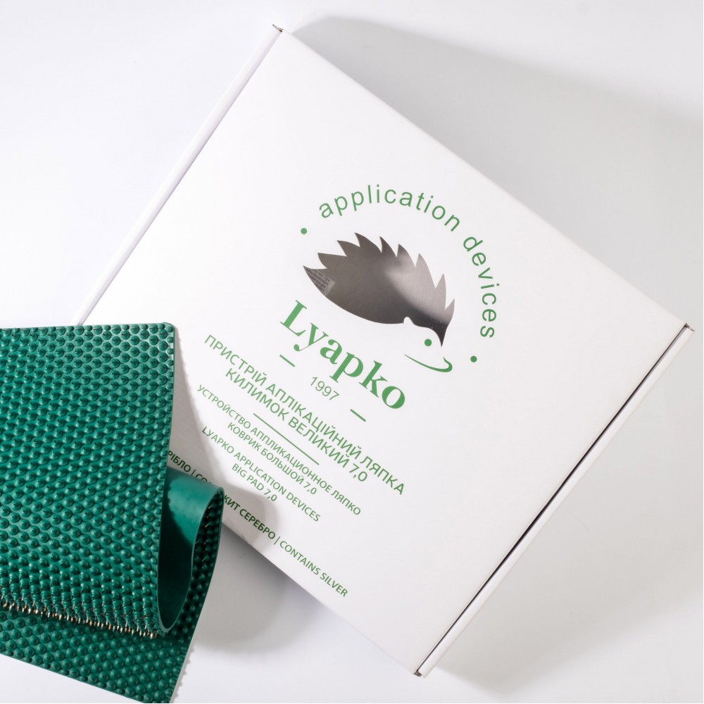Пристрій аплікаційний Ляпко «Килимок Великий», крок голки - 7,0, розмір - 275 х 480 мм, кількість голок: 2710. Склад: залізо, мідь, нікель, цинк, срібло, гума медичного призначення. Відмінною особливістю «Килимка» є його велика площа впливу і найбільша відстань між голками, завдяки чому він має підвищену ефективність лікування.