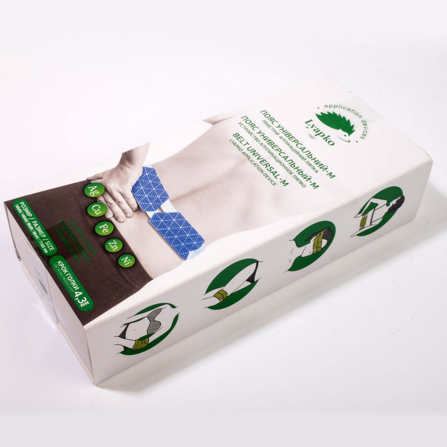 «Пояс Універсальний М» складається з 5 рухомих пластин і 2 регульованих поясів, які дозволяють переміщати пластини, вибираючи зручне положення для впливу на невеликі ділянки голови, тулуба, верхніх і нижніх кінцівок (розмір однієї пластини, що фіксується в області очей, — 140 × 65 мм (2 шт.), розмір 3 пластин, що фіксуються на область потилиці, — 90 × 65, 68 × 65, 77 × 65 мм.)