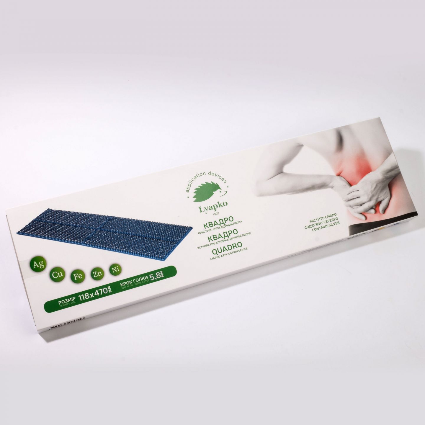 Пристрій аплікаційний Ляпко "Квадро" має крок голки - 5,8 мм, розмір - 118х470 мм, к-ть голок - 1780. Є універсальним аплікатором і може застосовуватися на будь-які зони. За бажанням може бути розрізаний поздовжньо і/або поперечно на 2 або 4 аплікатора для виборчої дії на окремі зони тіла з індивідуальним регулюванням тривалості дії кожного аплікатора.