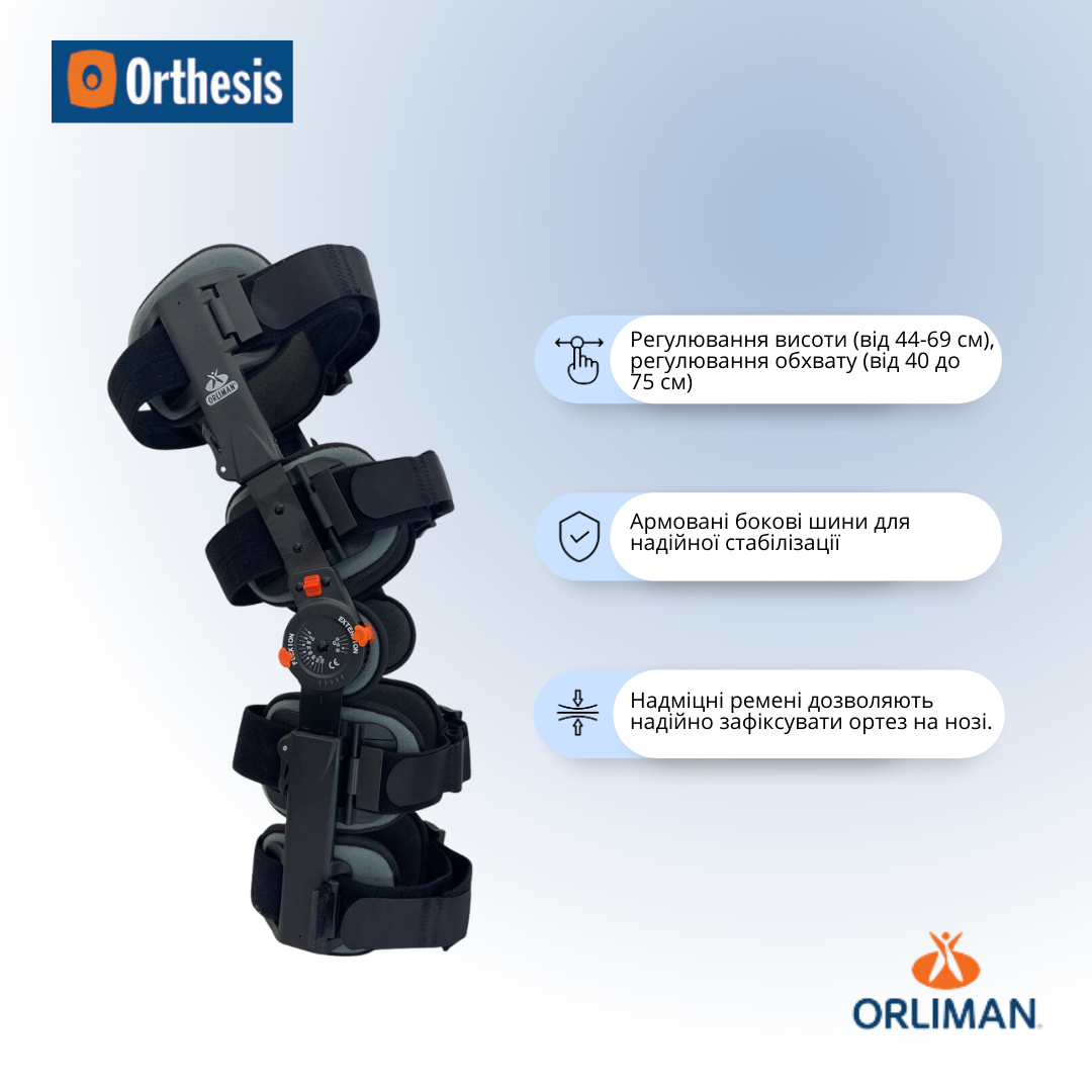 Ортез на колінний суглоб із замком для контролю згинання/розгинання в інтервалах 10º, від 0º до 120º та від – 10º до +30º. Ортез дозволяє іммобілізувати колінний суглоб, потім поетапно збільшувати діапазон руху суглоба на різних етапах реабілітації. Ортез універсального розміру та регулюється по висоті від 44-69 см. Фіксуючі ремені з липучками Micro-Velcro дозволяють регулювати ступінь прилягання ортезу до ноги. Усередині всі елементи ортезу виконані з м'якого, приємного на дотик матеріалу, який не викликає подразнень та алергії навіть при прямому контакті зі шкірою.