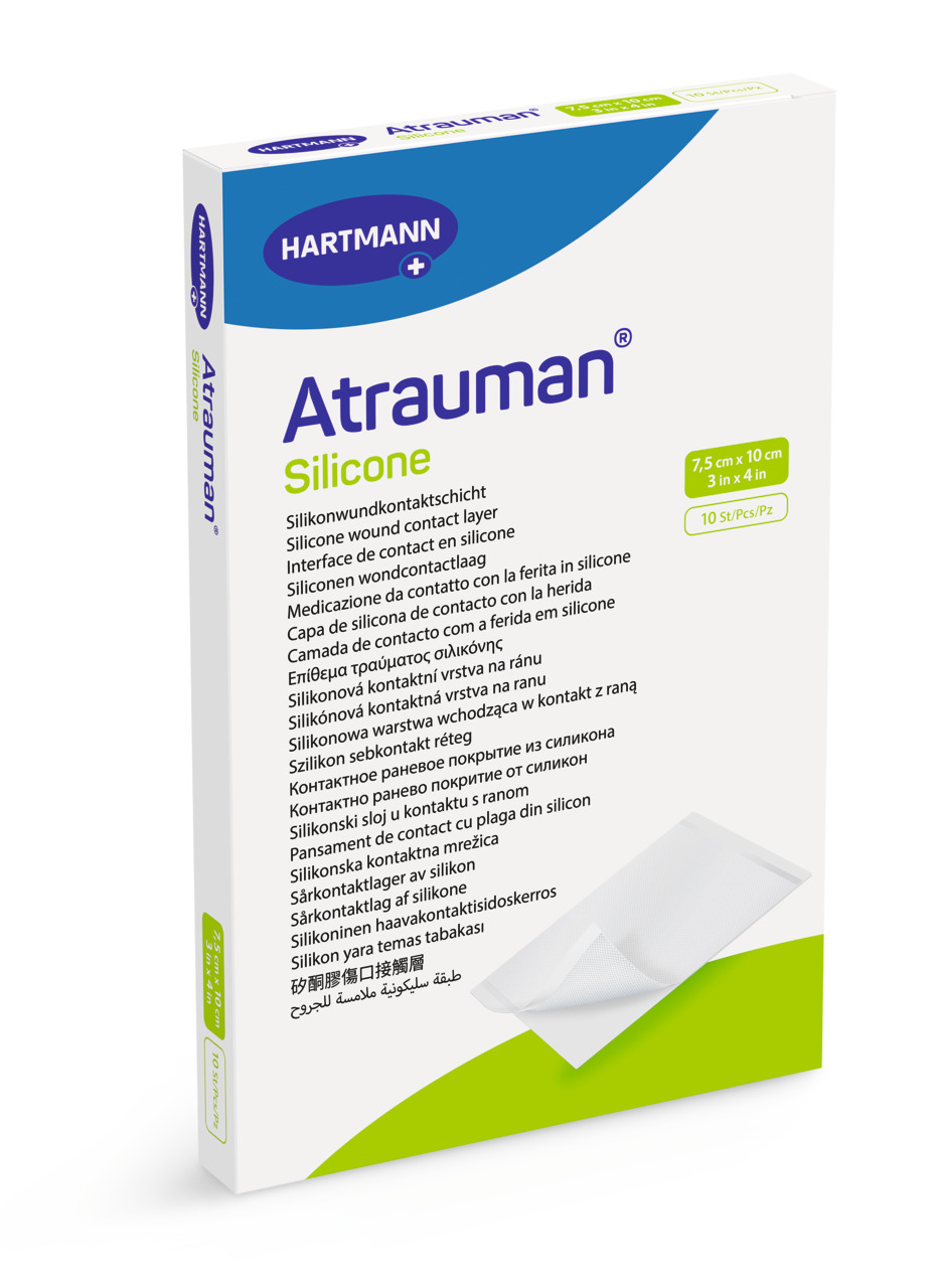 Atrauman Silicone має тонке, м'яке і добре драпіроване покриття. Воно забезпечує хороший контакт з поверхнею рани, забезпечує проникність для ексудату. За допомогою стерильних ножиць Atrauman Silicone можна обрізати відповідно до розміру рани, її форми і розташування.