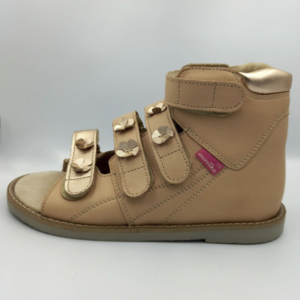 Ортопедичні босоніжки Aurelka 1003, бежевого кольору. Підходять для використання вдома, на вулиці, як змінне взуття у школі чи садку. Забезпечують правильне положення стопи під час ходьби. В результаті можна запобігти дефектам нижніх кінцівок. Взуття дуже зручне, добре пропускає повітря завдяки якісним матеріалам, що запобігає надлишковій пітливості ніг.