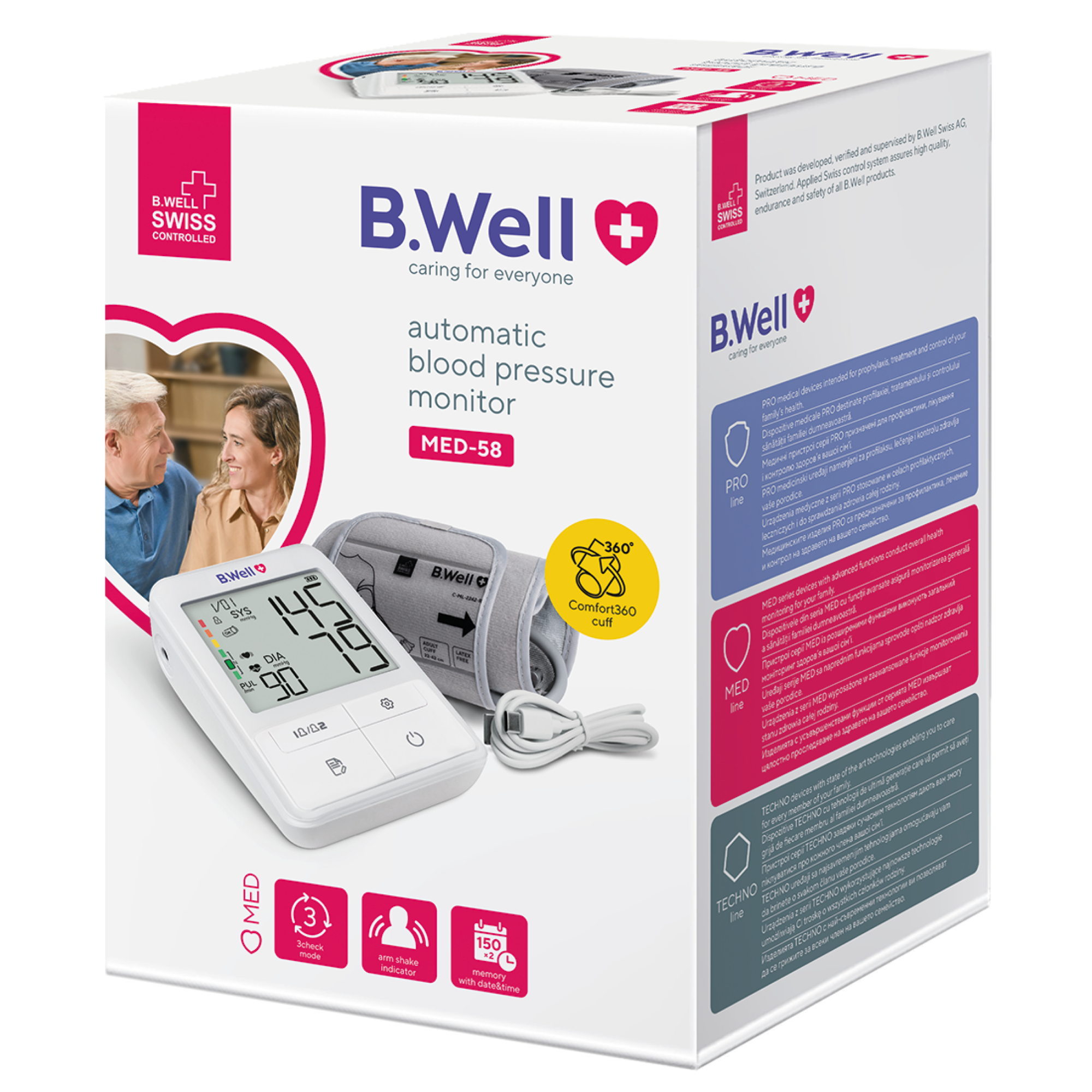 B.Well MED-58 – сучасний автоматичний тонометр із манжетою Comfort360 та інтелектуальним режимом 3CHECK для максимально точного вимірювання тиску вдома. Спрощений інтерфейс і унікальна манжета роблять прилад зручним навіть для літніх людей.