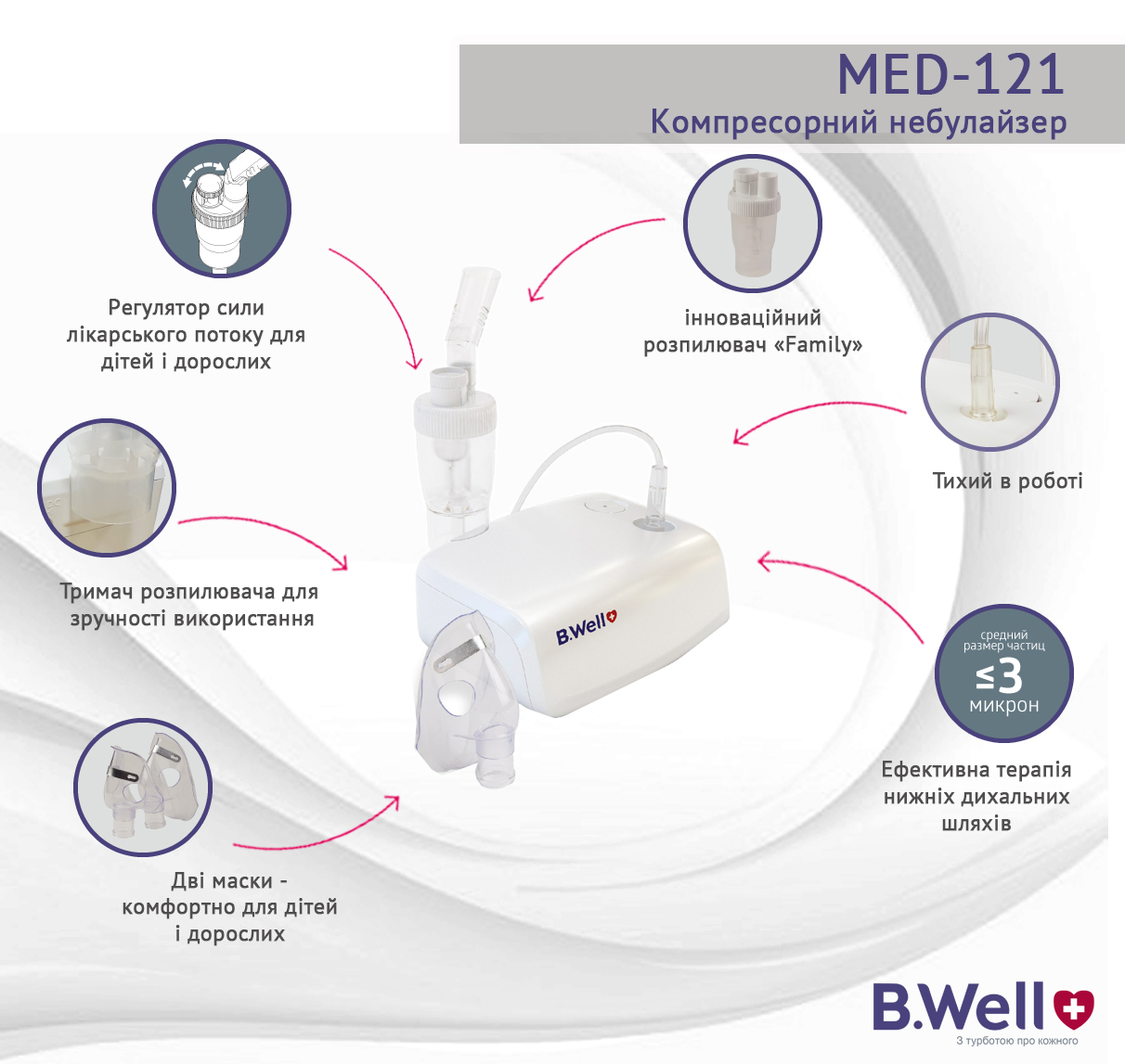 Компанія B.Well – світовий виробник високоякісних небулайзерів. Ефективний, компактний і тихий компресорний небулайзер B.Well MED-121 - це правильний вибір для здоров'я Ваших близьких.