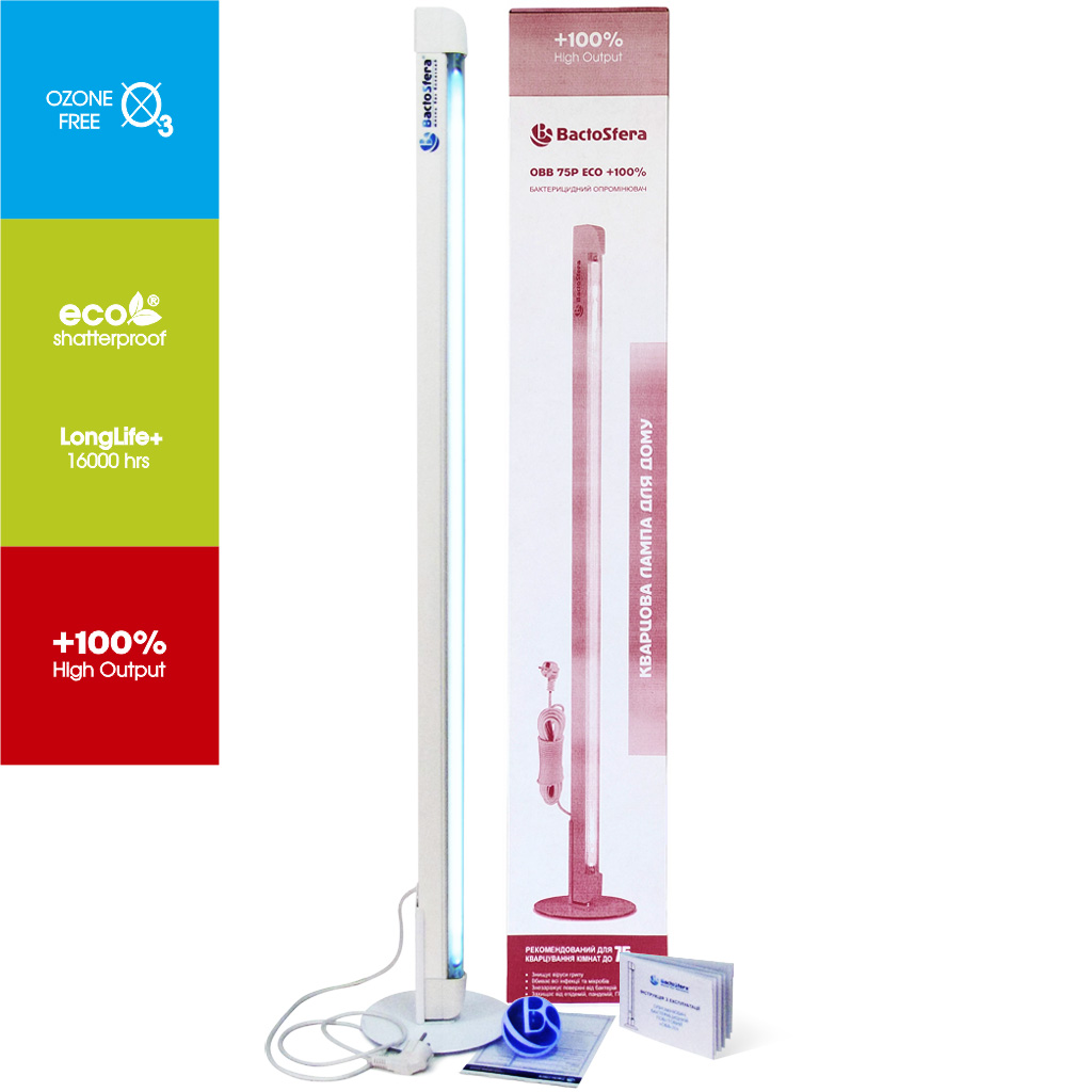 Бактерицидний опромінювач BactoSfera OBB 75P ECO +100% – це пристрій відкритого типу, який призначений для кварцування (знезараження) повітря та поверхонь в приміщенні прямими ультрафіолетовими променями бактерицидної дії. Використовується за умови відсутності в оброблюваному приміщенні людей і тварин, рослини та інші живі організми мають бути захищені від випромінювання.