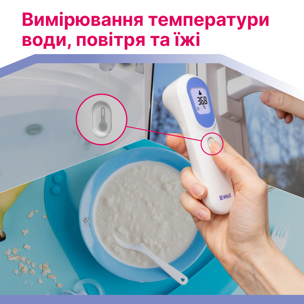 Цей термометр здатен замінити кілька пристроїв, адже дозволяє не лише перевіряти температуру тіла, а й визначати температуру води у ванні, повітря в приміщенні чи на вулиці, а також дитячого харчування перед годуванням.