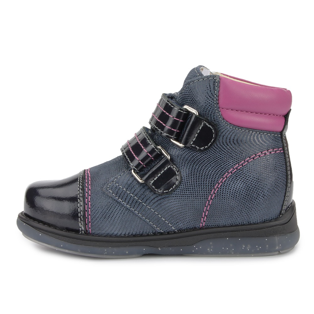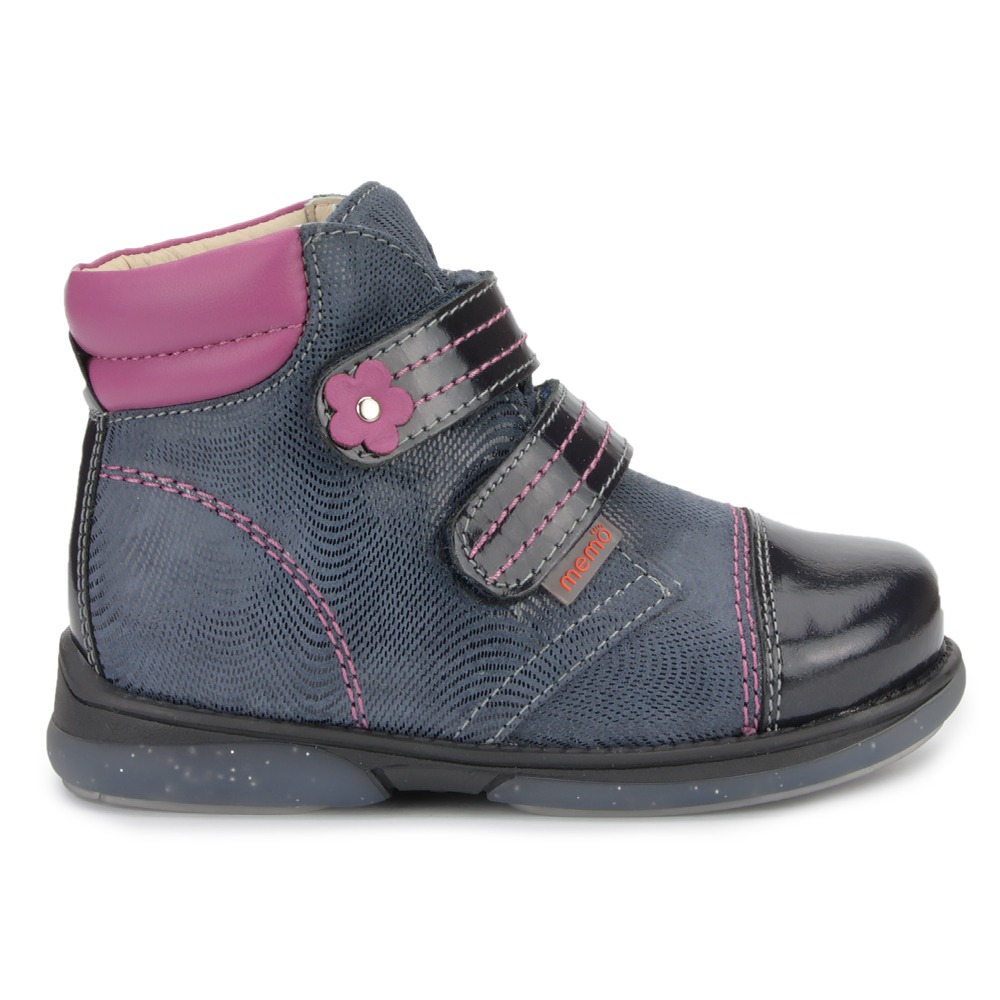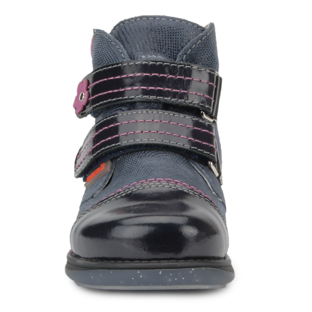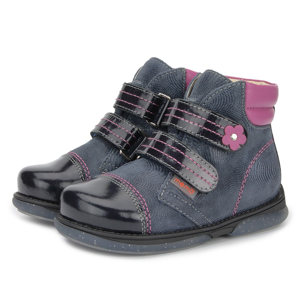 Дитячі ортопедичні черевики для дівчаток з весняної колекції Memo. Мають діагностичні, профілактичні та корекційні (з устілкою) властивості. Виготовлені з натуральної шкіри, шкіряна підкладка. У зоні щиколотки - м'які вставки з піни, які захищають шкіру від натирання. Черевички подобаються маленьким покупцям завдяки прикрасам-аплікаціям, і поєднанню різних відтінків синього кольору в одній моделі.