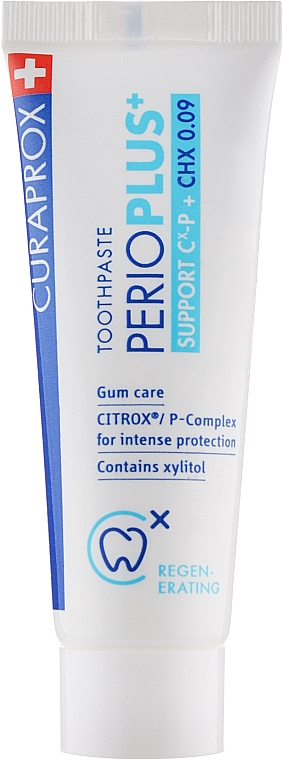 Опис Зубна паста Curaprox PerioPlus + Support mini, містить CITROX®, гіалуронову кислоту і 0,09% хлоргексидину, 10 мл