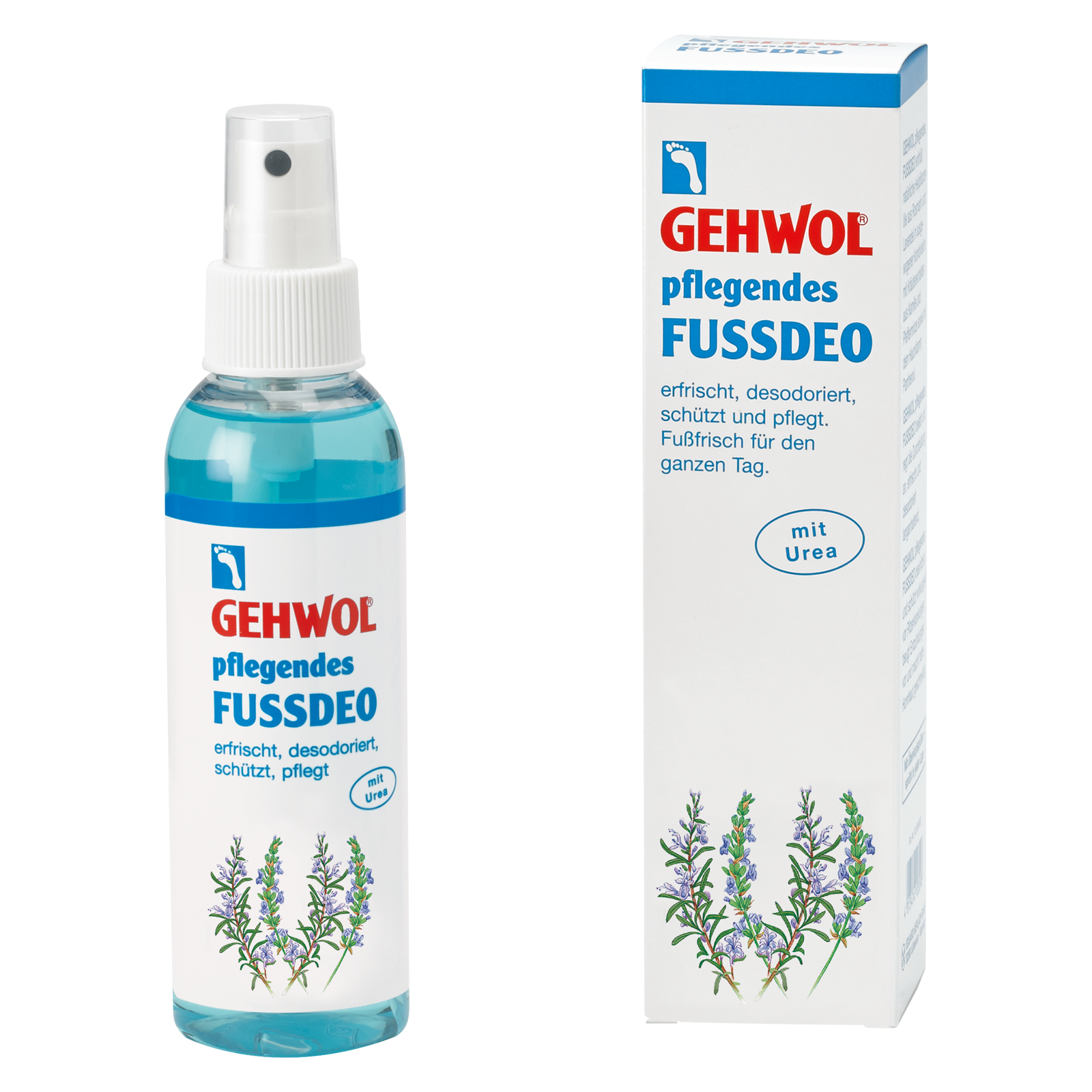 - Gehwol Caring Footdeo Spray тонізує шкірний покрив ніг, прискорює процеси відновлення на рівні клітин та надає антигрибкову та антимікробну дію, завдяки маслу розмарину;