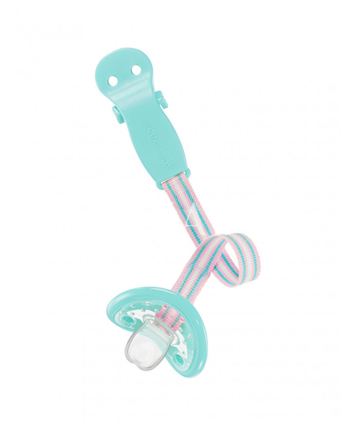 Тримач для пустушки світло-блакитного кольору Просто пристебніть пустушку – і вона залишиться чистою та там, де їй і місце. Має простий і безпечний механізм тримання, немає ризику поранитися. Цей тримач підходить для всіх пустушок Curaprox, а також для зубного кільця.