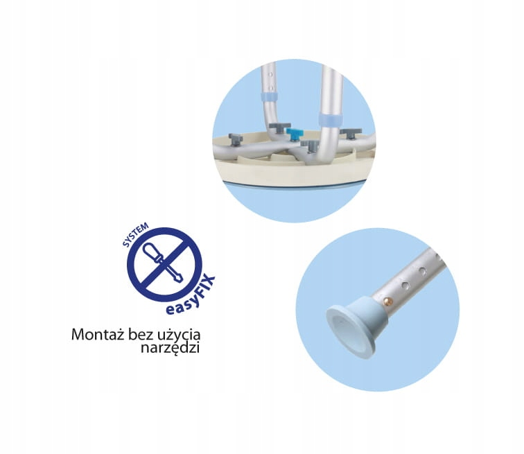 Сидіння для душу та ванної виготовлене з міцного пластику, стійкого до пошкоджень. Поверхня сидіння ребриста, що запобігає ковзанню. Ніжки виконані з алюмінію, стійкого до корозії. Крім того, ніжки мають нековзкі накладки, які забезпечують стійкість при виконанні гігієнічних процедур, надійно фіксуючи стілець на поверхні.