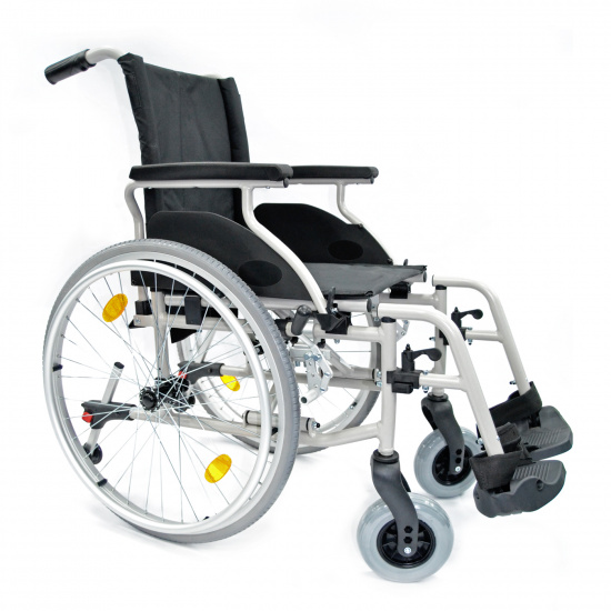 Зручні знімно-відкидні підлокітники для комфортного переміщення користувача з та в крісло. Рама коляски виготовлена з міцного алюмінію. Фіксована спинка з нейлоновою оббивкою, висотою 450 мм. Глибина сидіння не змінюється і складає 410 мм. Накладки на підлокітниках скошені під кутом, що дозволяє людині безперешкодно під'їхати та комфортно розміститися за будь-якою поверхнею. Коляска оснащена зручними прогумованими рукоятками для переміщення за допомогою супроводжуючого. Самостійне управління користувачем коляски відбувається за рахунок ручного обертання обода, який є безпечним та зручним. Коляска оснащена протиперекидними пристроями, які забезпечують безпеку пересування на нерівних поверхнях, додають додаткову опору та стабілізують коляску. Великі задні колеса, діаметром 24" з металевими спицями та литими шинами. Передні литі колеса, діаметром – 8". Також коляска оснащена двома надійними паркувальними гальмами, які розташовуються збоку під сидінням.