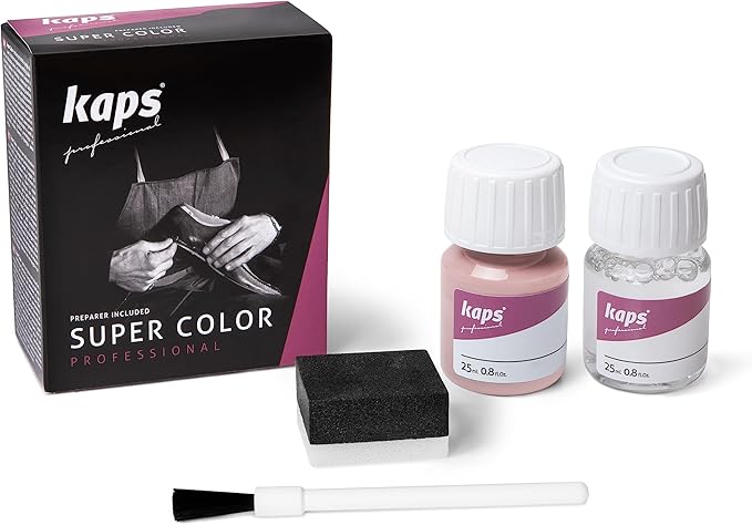 Фарба для взуття + засіб для фарбування Kaps Super Color + Preparer 25 ml використовується для натуральної шкіри, текстилю та синтетики. Має водостійкі властивості. Добре відновлює колір пофарбованої поверхні та зберігає його на тривалий час.