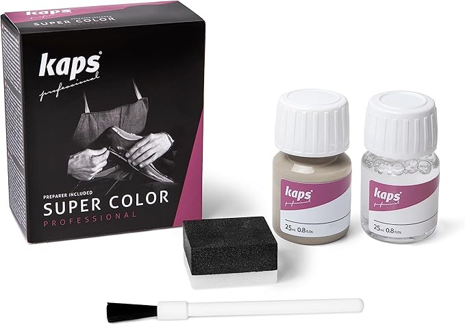 Фарба для взуття + засіб для фарбування Kaps Super Color + Preparer 25 ml використовується для натуральної шкіри, текстилю та синтетики. Має водостійкі властивості. Добре відновлює колір пофарбованої поверхні та зберігає його на тривалий час.