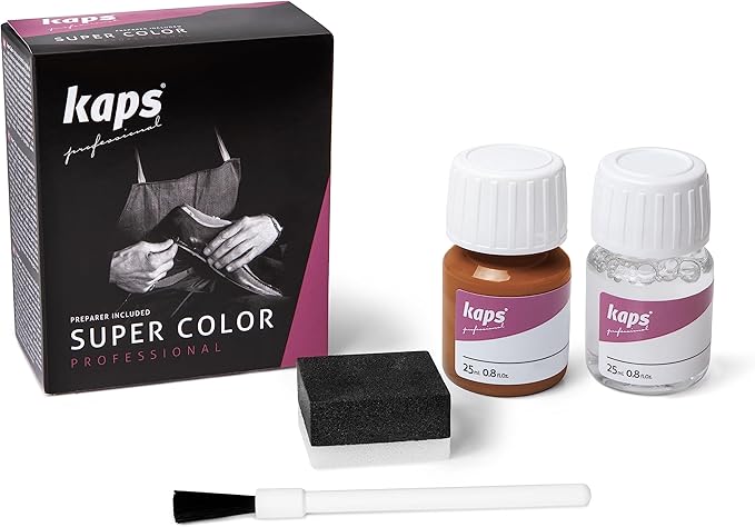 Фарба для взуття + засіб для фарбування Kaps Super Color + Preparer 25 ml використовується для натуральної шкіри, текстилю та синтетики. Має водостійкі властивості. Добре відновлює колір пофарбованої поверхні та зберігає його на тривалий час.