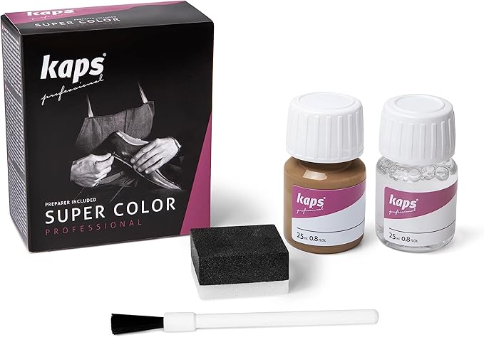 Фарба для взуття + засіб для фарбування Kaps Super Color + Preparer 25 ml використовується для натуральної шкіри, текстилю та синтетики. Має водостійкі властивості. Добре відновлює колір пофарбованої поверхні та зберігає його на тривалий час.