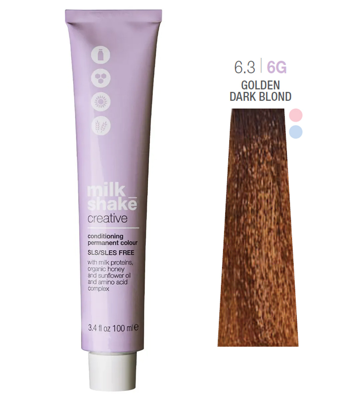 БрендMilk_Shake Об'єм100 мл Країна виробникІталія Колір фарби6.3/6G Golden Dark Blond КласифікаціяПрофесійна СеріяCreative