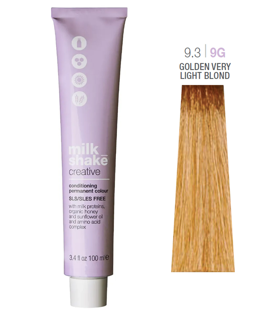 БрендMilk_Shake Об'єм100 мл Країна виробникІталія Колір фарби9.3/9G Golden Very Light Blond КласифікаціяПрофесійна СеріяCreative
