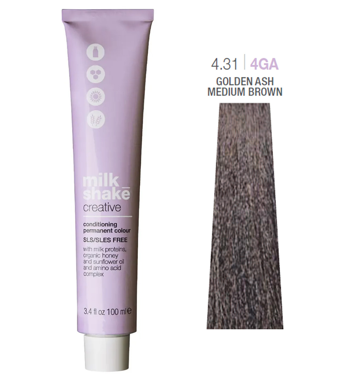 БрендMilk_Shake Об'єм100 мл Країна виробникІталія Колір фарби4.31/4GA Golden Ash Medium Brown КласифікаціяПрофесійна СеріяCreative