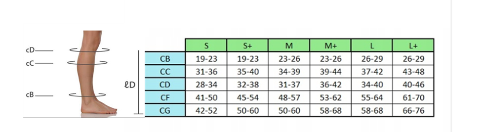 - Для правильного визначення розміру виміряйте обхвати ніг (лівої та правої) в точках, зазначених у таблиці нижче.