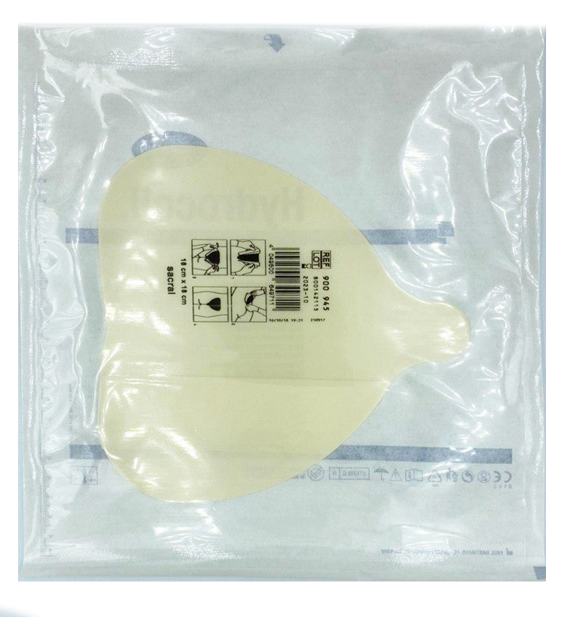 Hydrocoll sacral: Видаліть захисний папір, накладіть пов'язку на рану в області крижів і притисніть. Виступаючий кінець може бути спрямований вгору або вниз залежно від розташування та глибини виразки. Краї добре притисніть.