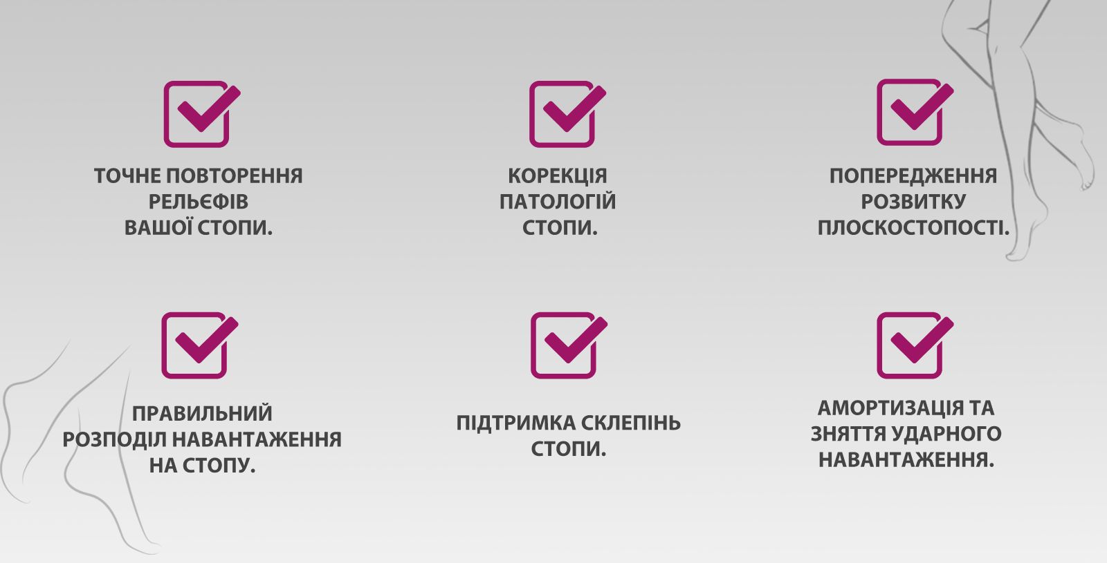 - Індивідуальний ортез проектується виключно на підставі статичної та динамічної діагностики за допомогою бароподометричної платформи, або за технологією зліпку стопи з використанням 3d подоскана.