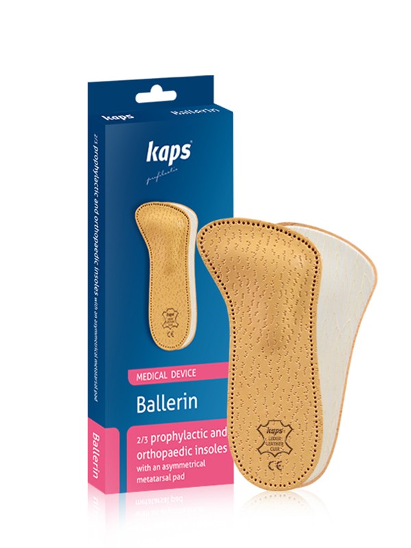 Ортопедичні напівустілки Kaps Ballerin призначені для людей з поперечною плоскостопістю. Зроблені зі спіненого латексу, верхній шар виконаний з натуральної дихаючої шкіри, яка добре вбирає вологу. Гнучка арочна підтримка ортопедичної устілки виготовлена зі спеціального матеріалу Тексон, який має протиковзкі властивості.