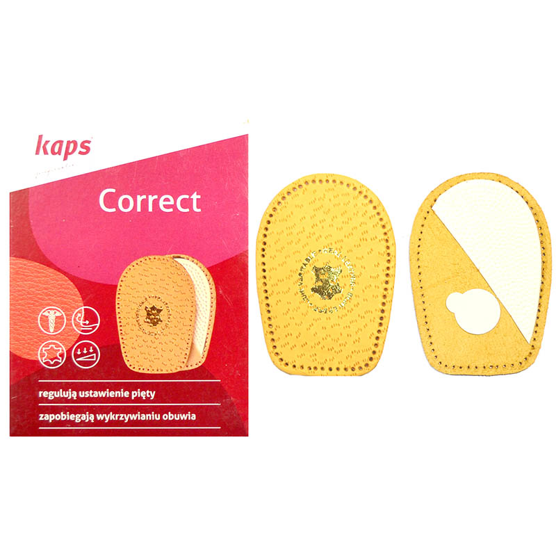 Підп'яточники Kaps Correct допомагають регулювати правильне положення стопи, для правильної постановки ніг і прямої ходи. Призначені для використання при нерівномірному зносі взуття. Підп'яточники Kaps Correct запобігають надмірному зносу і деформації каблуків. Підп'яточники виготовлені з овечої шкіри та спеціального матеріалу «moosgummi».