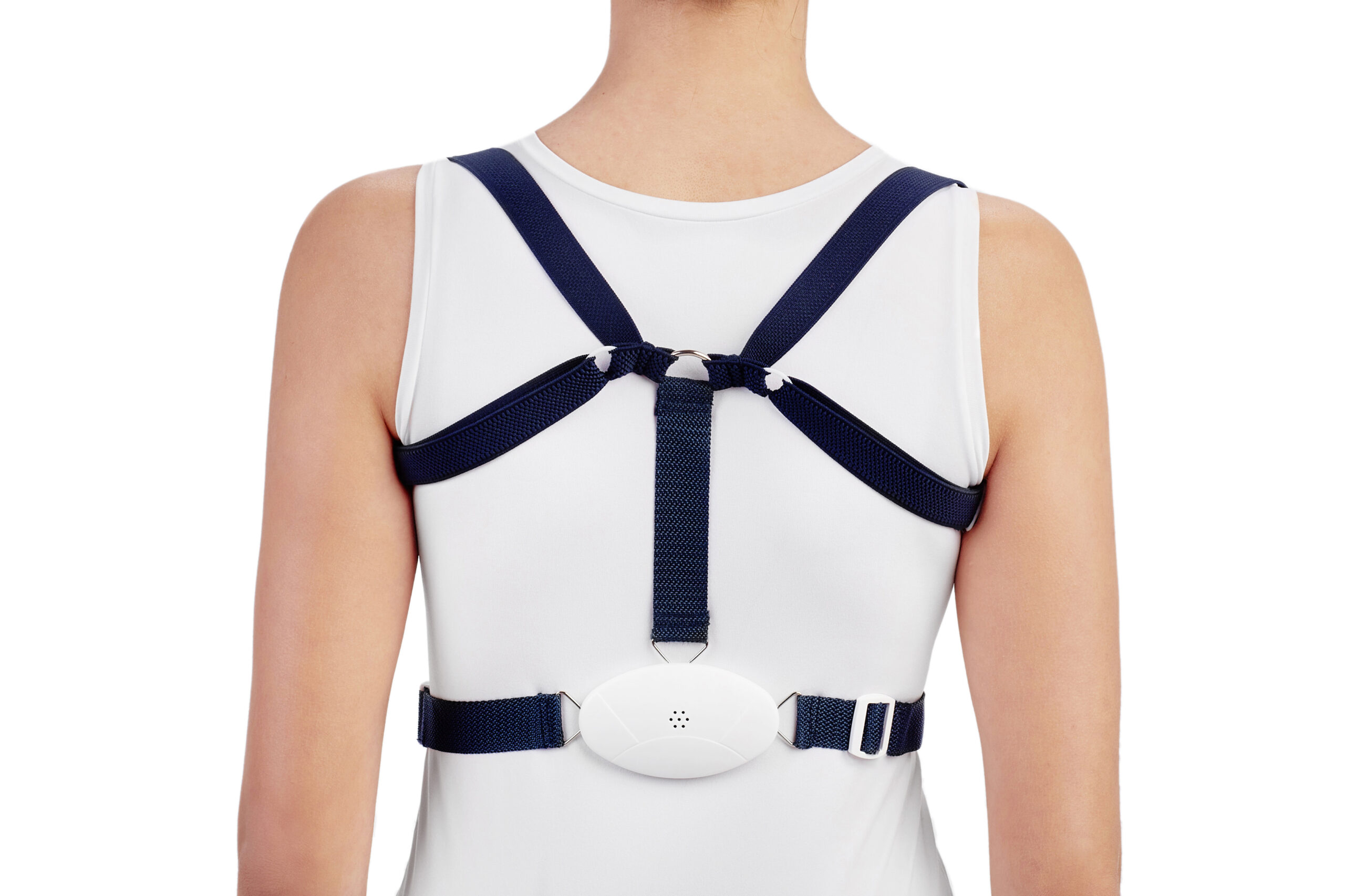 - Вставте руки в ремінь таким чином, щоб пластикова частина з електронним модулем знаходилася по центру між лопатками на спині. При необхідності підкоригуйте довжину підтяжок під свою фігуру. Вони не можуть бути занадто тісними або занадто вільними.