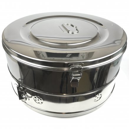 Опис Коробка стерилізаційна з нержавіючої сталі SCHIMMELBUSCH № 24. Діаметр 390 мм, висота 190 мм