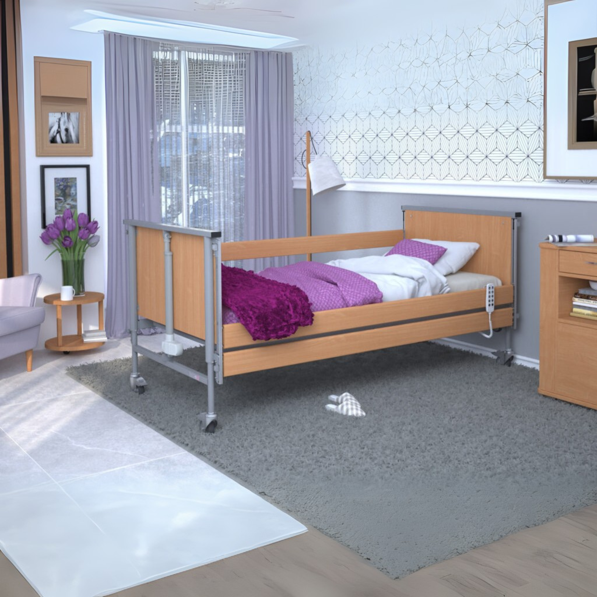 Електропривод для регулювання положень: Ліжко з електричним приводом дозволяє легко піднімати головну та ножну секції, забезпечуючи комфортне положення для пацієнта без зусиль з боку медичного персоналу.