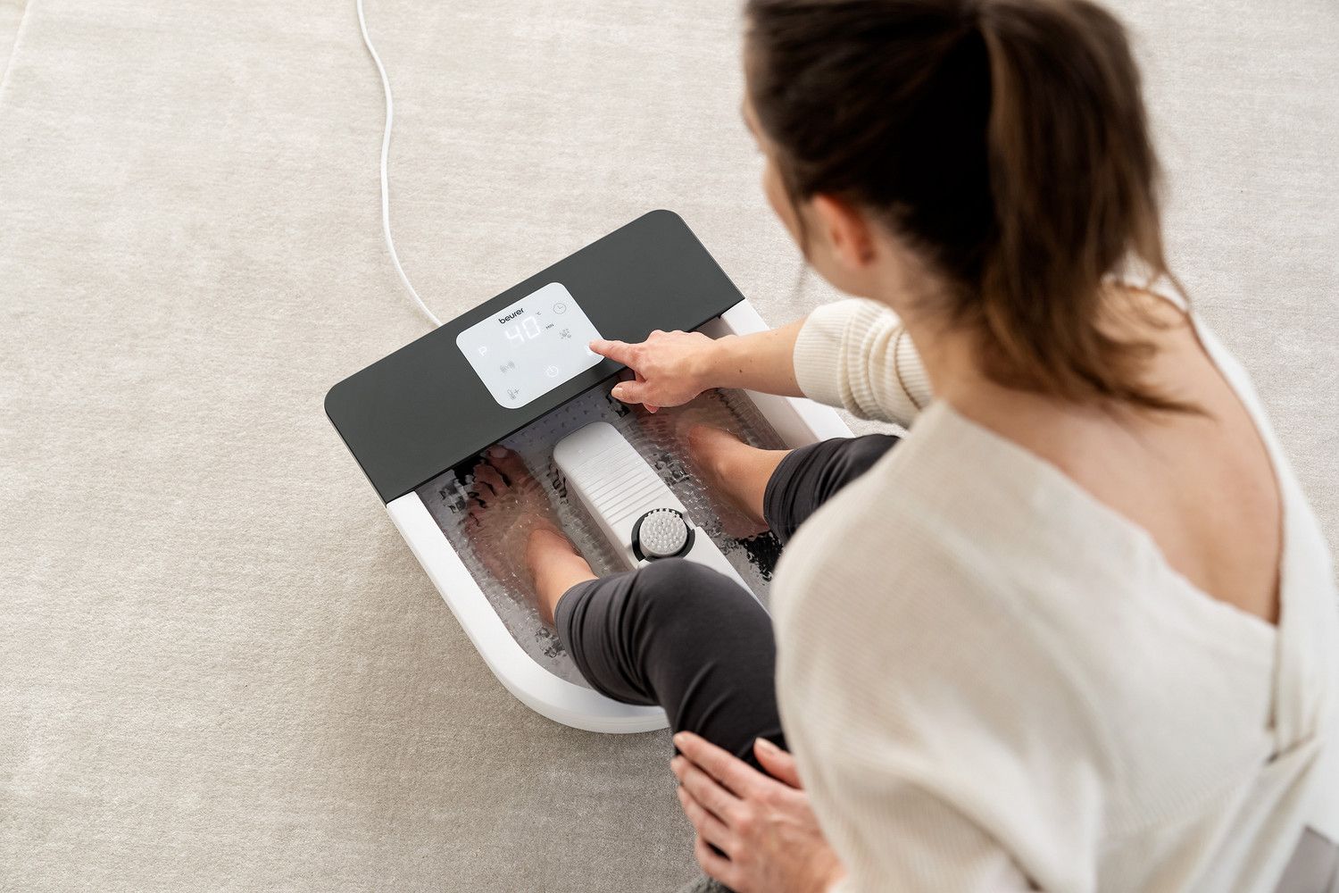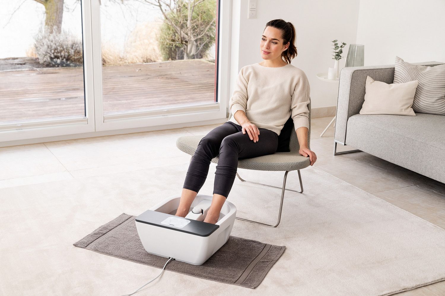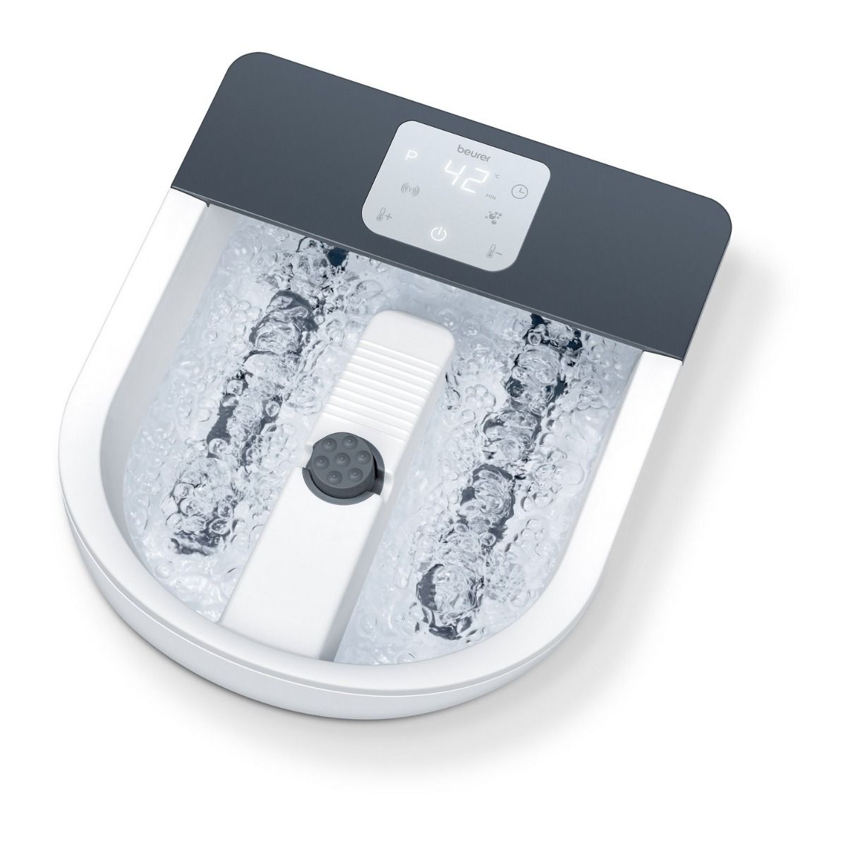 Масажна ванна для ніг з потужним нагріванням води. Вісім рівнів температури води. Розслаблюючий вібраційний та бульбашковий масаж. Підходить для ступнів до 51 розміру.