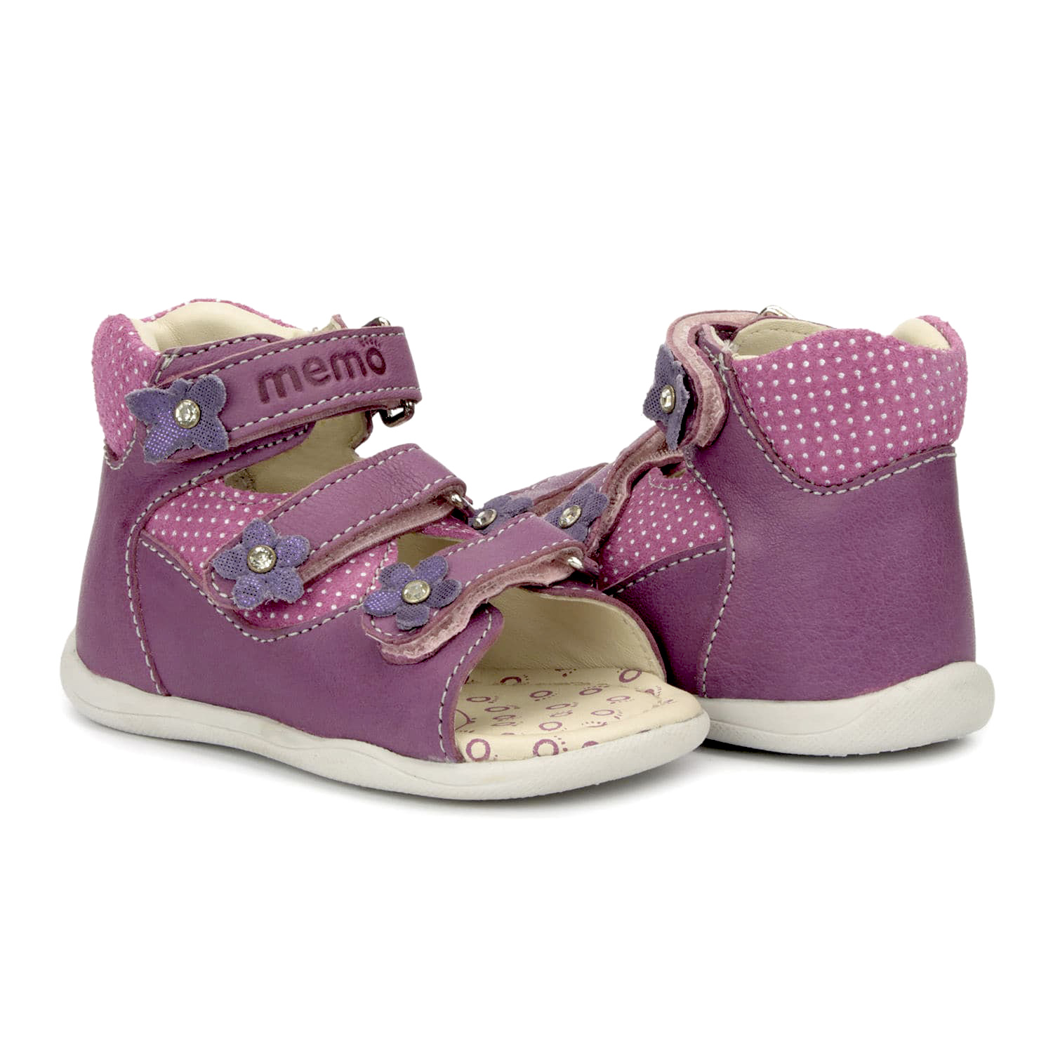 Новинка 2020! Ортопедичні босоніжки для дівчаток Memo Doris поповнили колекцію Memo Baby. Натуральна козяча шкіра, яку використовують для виробництва взуття Memo, відзначається міцністю і м'якістю. Матеріал добре пропускає повітря, тому ніжки дитини менше пітніють. Верхні елементи в зоні щиколотки наповнені піною, це додатково захищає ніжки від тертя.