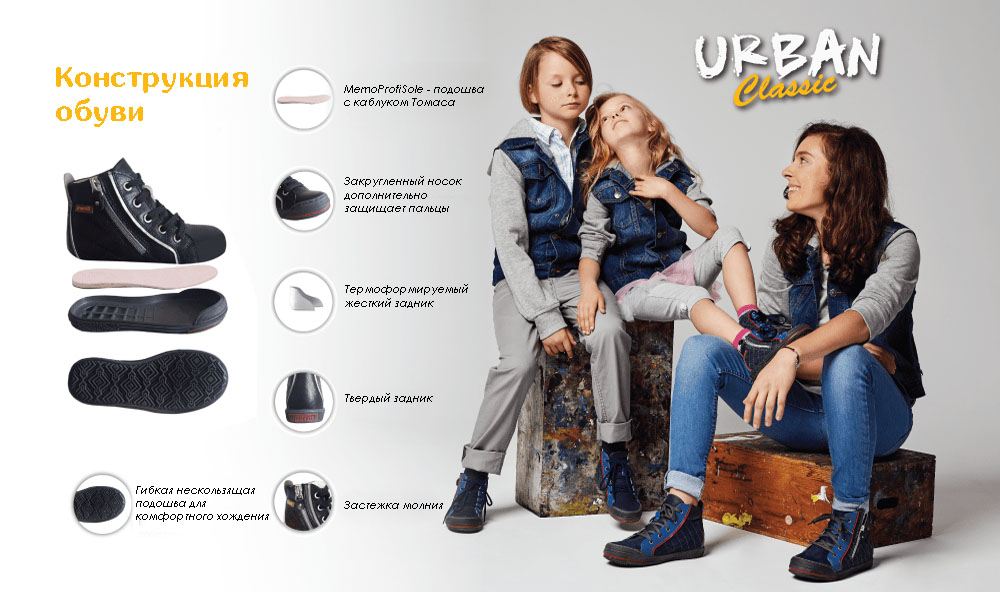 Urban Classic - це унікальне поєднання цікавих рішень, які мають позитивний вплив як на зростання і здоров'я дитячих ніжок, так і на розробку дизайну, який обов'язково доведеться дитині до душі.