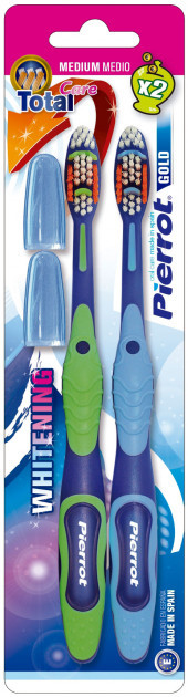 Спеціальна пропозиція для сім'ї: 2 щітки в 1 упаковці. Високотехнологічна зубна щітка Pierrot Gold (середньої жорсткості), щетинки гнучкі та виступають на кінчику щітки. Дбайливо видаляють зубний наліт, полірують емаль.