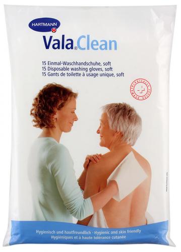 Одноразові рукавички для миття Vala®Clean soft з м'якого і стійкого до розривів нетканого матеріалу, дуже м'які, з відмінними поглинаючими здібностями. Призначені для інтимної гігієни при нетриманні, індивідуальної гігієни у всіх областях догляду за хворими. Мають закруглене отвір для зручного одягання.