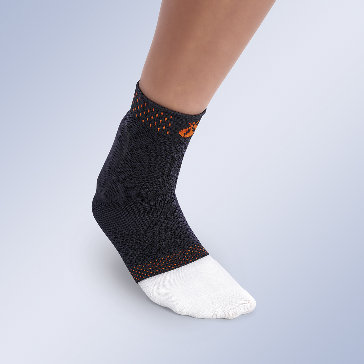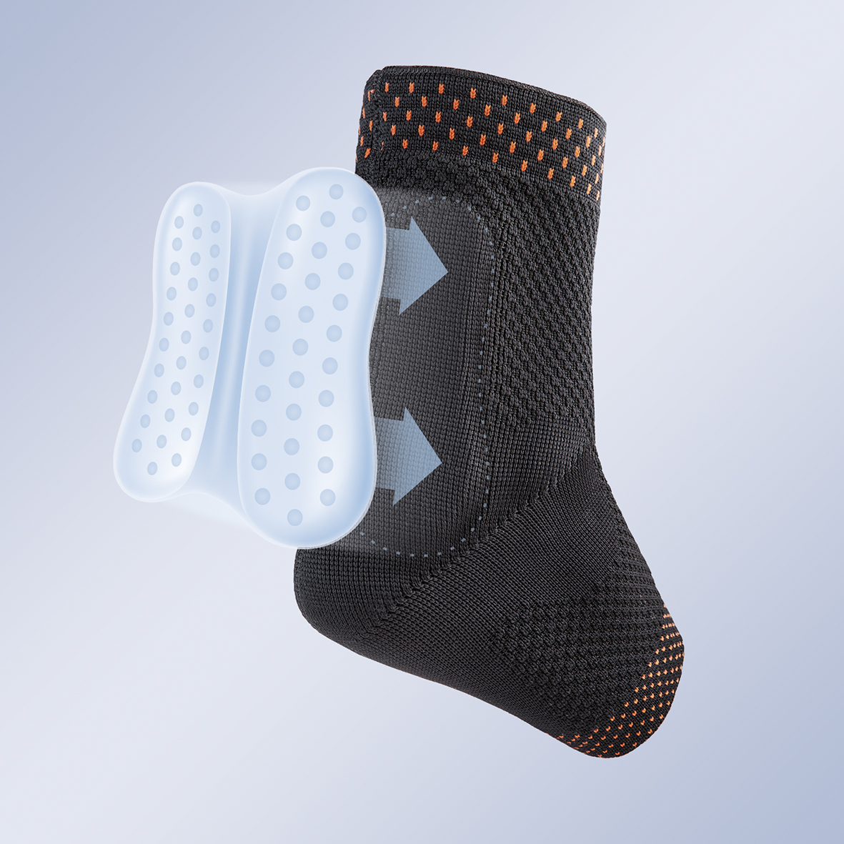 Силіконові вставки забезпечують додаткову фіксацію та розподіляють компресію вздовж ахіллового сухожилля. Ортез сприяє розвантаженню пошкодженої зони під час руху. Інноваційна технологія безшовного кріплення всіх елементів унеможливлює виникнення подразнень та пошкоджень шкіри.