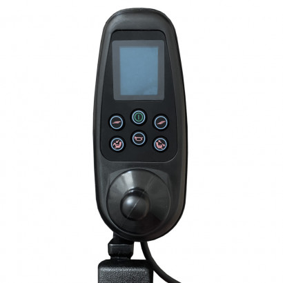 - На пульті управління передбачені: кнопка ВКЛ. / ВИКЛ .; екран, на якому зображені індикатори заряду батареї і швидкості пересування; кнопка звукового сигналу; кнопки збільшення і зменшення швидкості; кнопки скласти / розкласти коляску.