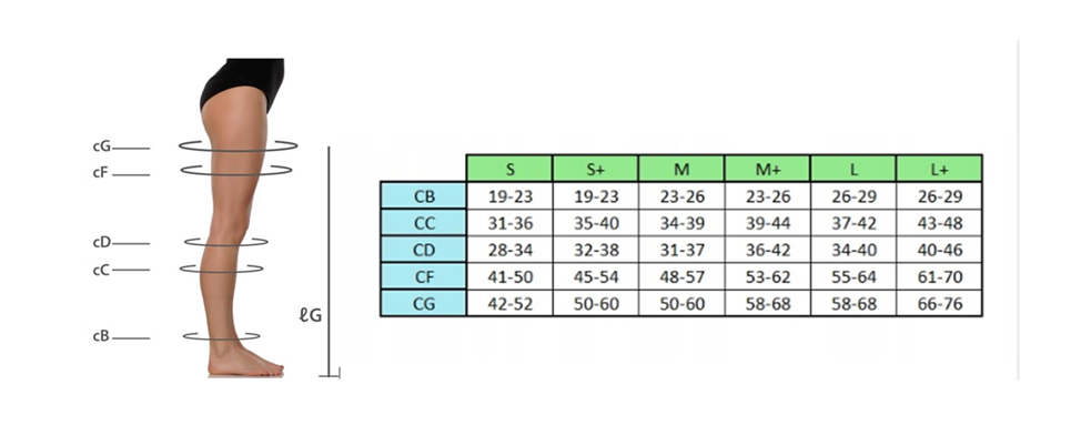 • Для правильного визначення розміру виміряйте обхвати ніг (лівої та правої) в точках, зазначених у таблиці нижче.