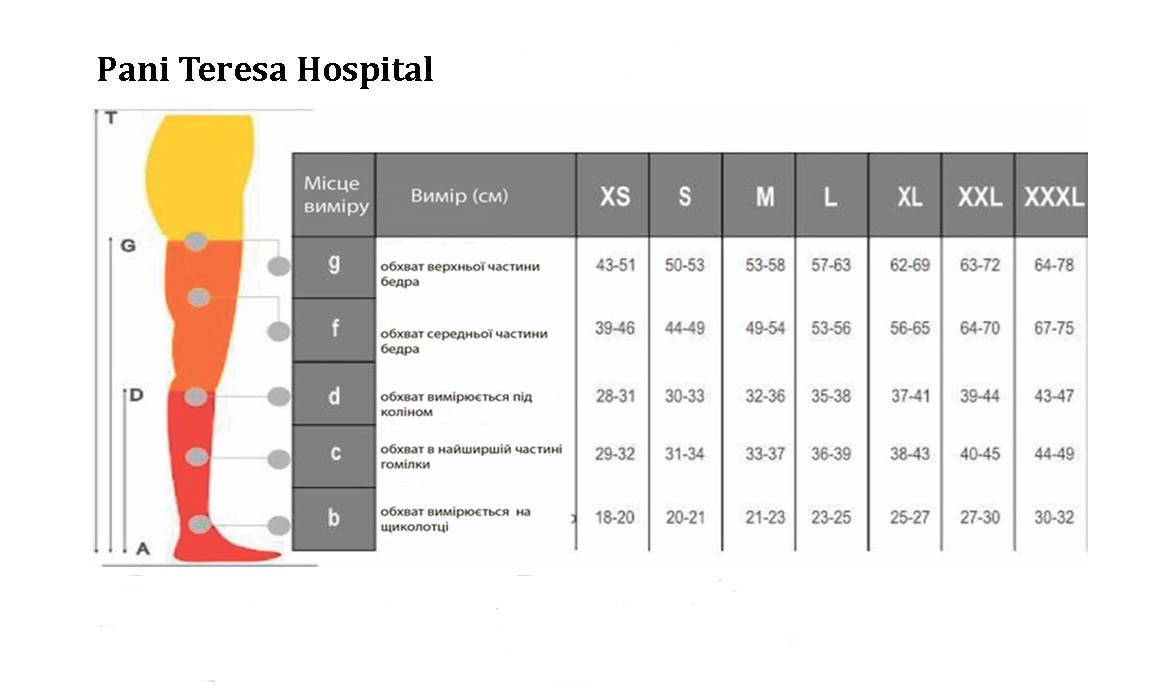 Післяопераційні профілактичніпанчохивиробник PANI TERESA. Панчохи медичні білого кольору використовуються до і після операції. Ці вироби з легким розслаблюючим розподіленим тиском, використовуються також для профілактики варикозного розширення вен. Панчохи PANI TERESA –ЛІКАРНЯ зроблені з ретельно перевіреної речовини не шкідливої для людини. Вони гарантують ефективний захист від тромбозу пацієнтам іммобілізованих в результаті різних видів хірургічних втручань. Тільки правильний вибір розміру виробу забезпечує лікарську цінність. Розмірна сітка виробів торгової марки Pani Teresa є міжнародним стандартом. Щоб встановити розмір Вам необхідно заміряти конкретні місця на нозі (див. таблицю нижче). Робити заміри ніг слід після сну. Заміряти потрібно праву та ліву ноги, оскільки розміри можуть не співпадати. Медичний компресійний трикотаж виготовлений у відповідності із високим європейським стандартом, затвердженим на високій якості. Під час виготовлення використовуються технології 21 століття.