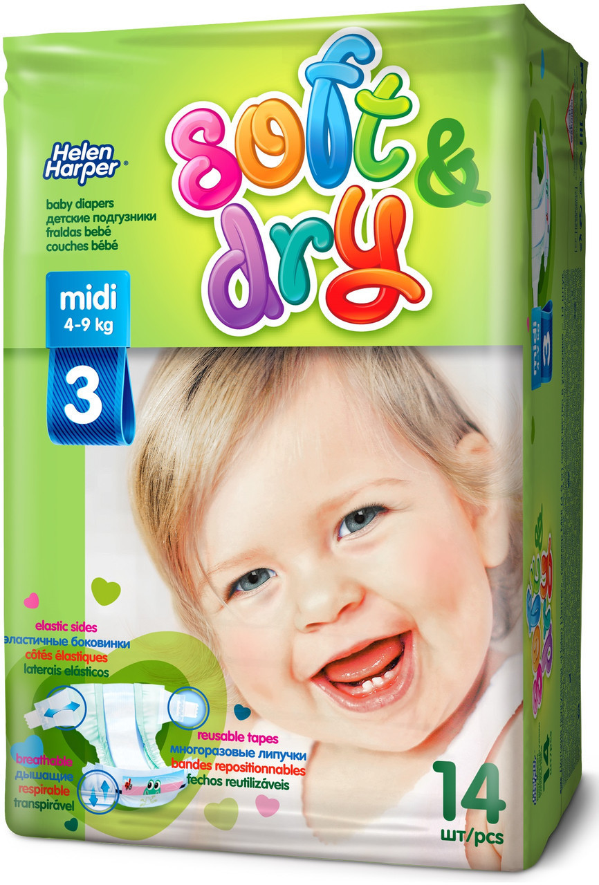 Хелен Харпер Soft&Dry – підгузки з удосконаленою формою та системою поглинання. Крім цього, виробники (бельгійська компанія "Ontex") заявляють про використання більш тонких прошарків, за рахунок чого виріб сидить комфортніше.