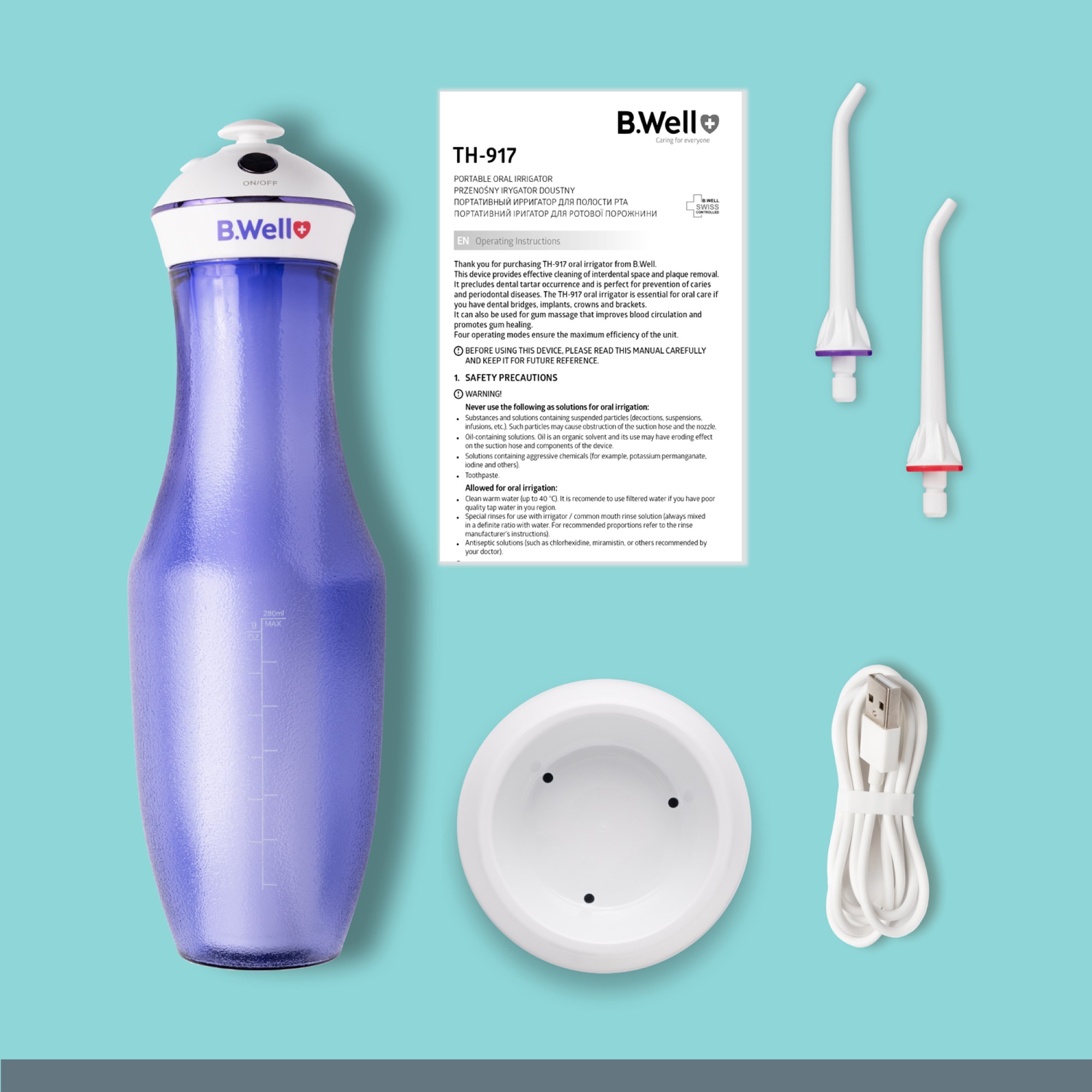 Портативний іригатор B.Well TH-917 – це прилад для щоденного догляду за порожниною рота. Він ефективно видаляє залишки їжі та бактерії, запобігаючи утворенню зубного каменю, гінгівіту та карієсу. Модель оснащена чотирма режимами, які дозволяють налаштувати тиск води відповідно до потреб користувача, від нормального очищення до м'якого масажу. Ємність резервуару на 280 мл забезпечує безперервне використання без необхідності частого доливання води, а обертова насадка на 360° дозволяє зручно чистити важкодоступні місця. Іригатор заряджається через USB, що забезпечує зручність та мобільність. Повного заряду вистачає до 30 днів безперервного використання. Ідеальний для використання вдома або в подорожах.