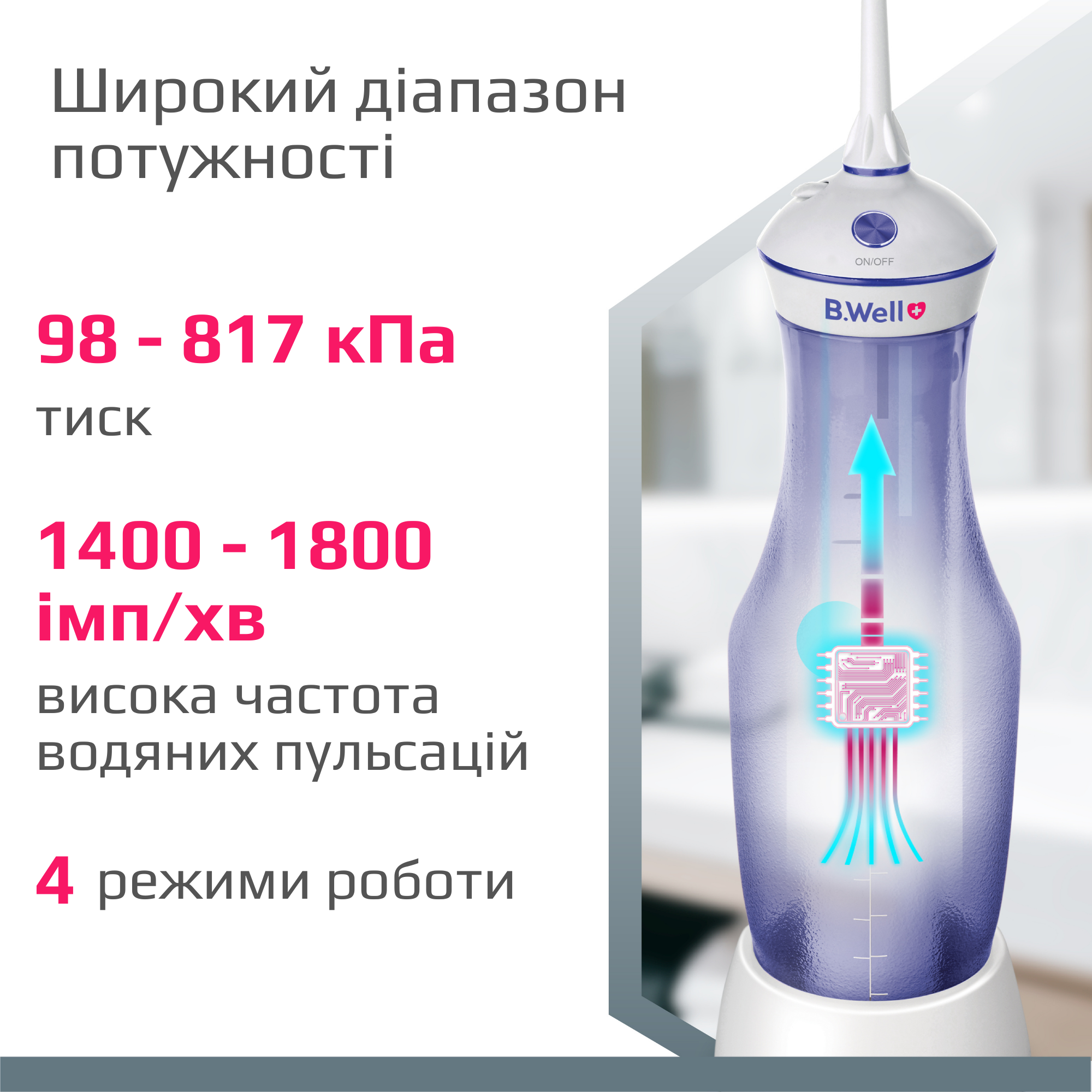 Потужність та частота пульсації іригатора B.Well TH-917 не поступаються стаціонарному приладу, що гарантує високоякісну гігієну порожнини рота та виконання завдання на 100%.