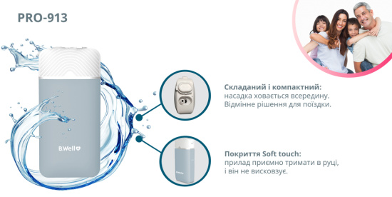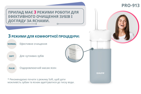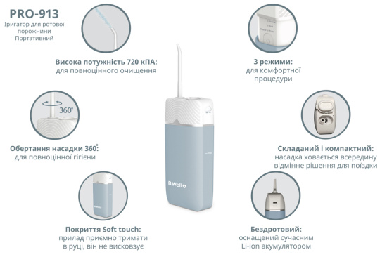 Міні іригатор для ротової порожнини B.Well PRO-913 – професійний прилад, в якому все передбачено для повноцінного догляду за зубами та порожниною рота вдома та в подорожі.