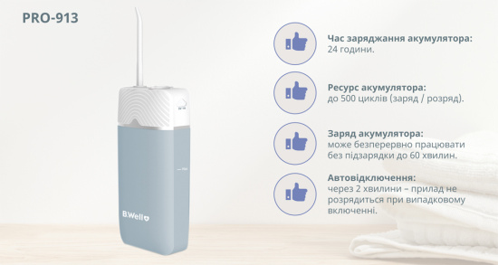 Іригатор B.Well PRO-913 працює в імпульсному режимі, саме такий принцип роботи іригатора має доведену ефективність. З B.Well PRO-913 легко підібрати комфортний режим. Потужність в залежності від режиму варіюється від 207 до 720 кПа. Насадка обертається на 360 °, щоб очистити важкодоступні місця. Складний та компактний: зручно брати з собою, прилад легко поміститься у будь-яку сумку, рюкзак і навіть у кишеню. Водонепроникна сумка входить до комплекту. Портативний іригатор PRO-913 легко заряджається від Micro USB адаптера, Power bank, ноутбука або комп'ютера. Однією повною зарядкою приладу вистачає до місяця роботи використання по 2 хвилини на день. Міні іригатор ідеально підійде для індивідуального використання.
