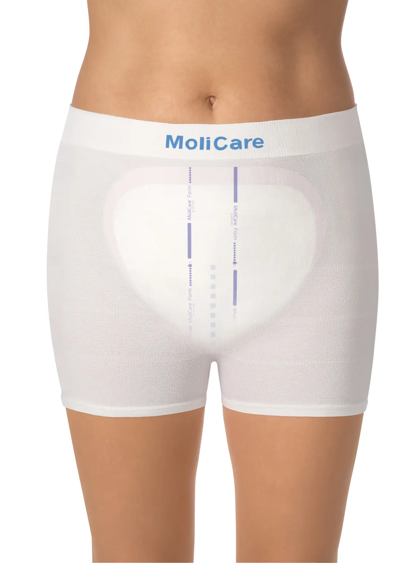 Прокладки анатомічної форми при нетриманні MoliCare® Premium Form рекомендовано поєднувати з багаторазовими еластичними штанцями для фіксації прокладок MoliCare Premium Fixpants.