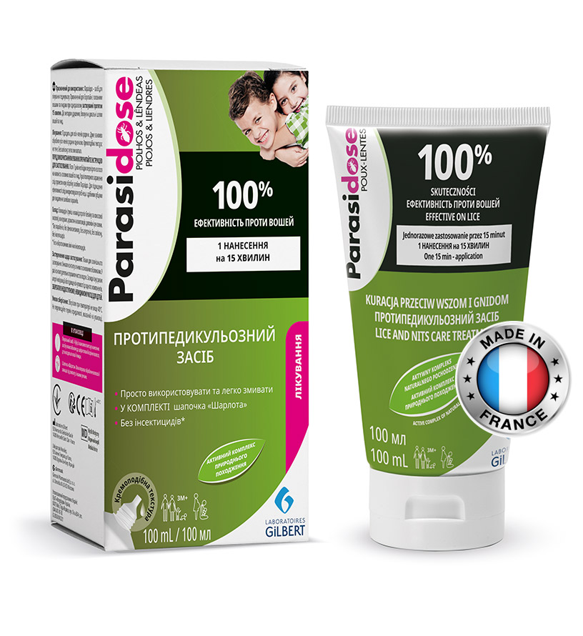 Протипедикульозний засіб Parasidose+ Lice&Nits; Treatmen Care від французької компанії Laboratories Gilbert випускається у вигляді білої емульсії у флаконі з зручним аплікатором. Має приємний аромат і не містить хімічних елементів.