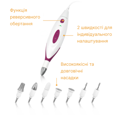 Набор включает в себя семь различных насадок с абразивным покрытием, что гарантирует длительную эффективную работу устройства и износостойкость насадок. Устройство очень простое в использовании, работает от сети. Имеет удобный кейс для хранения. Апарат по уходу за ногтями МР 840 имеет 3 скорости оборотов: 1 – 3500 об/мин, 2 – 5000 об/мин, 3 – 8000 об/мин. Все скорости переключаются плавно, без резкой смены. Также преимуществом является наличие функции автоматического отключения при сильном давлении, поэтому может использоваться для людей с диабетом. Профессиональный маникюр и педикюр не выходя из дома, ухаживайте за Вашими ногтями с легкостью и удовольствием вместе с Medisana!