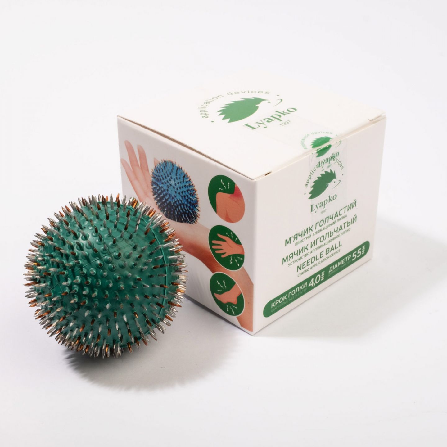 Устройство аппликационное Ляпко «Мячик игольчатый», шар диаметром 55 мм, расстояние между иглами — 4 мм, кол-во игл - 656. «Мячик игольчатый» - универсальный аппликатор. Благодаря своей округлой форме он является незаменимым помощником для нормализации деятельности всех органов и систем организма, а также используется для восстановления жизненного тонуса, хорошего настроения и работоспособности.