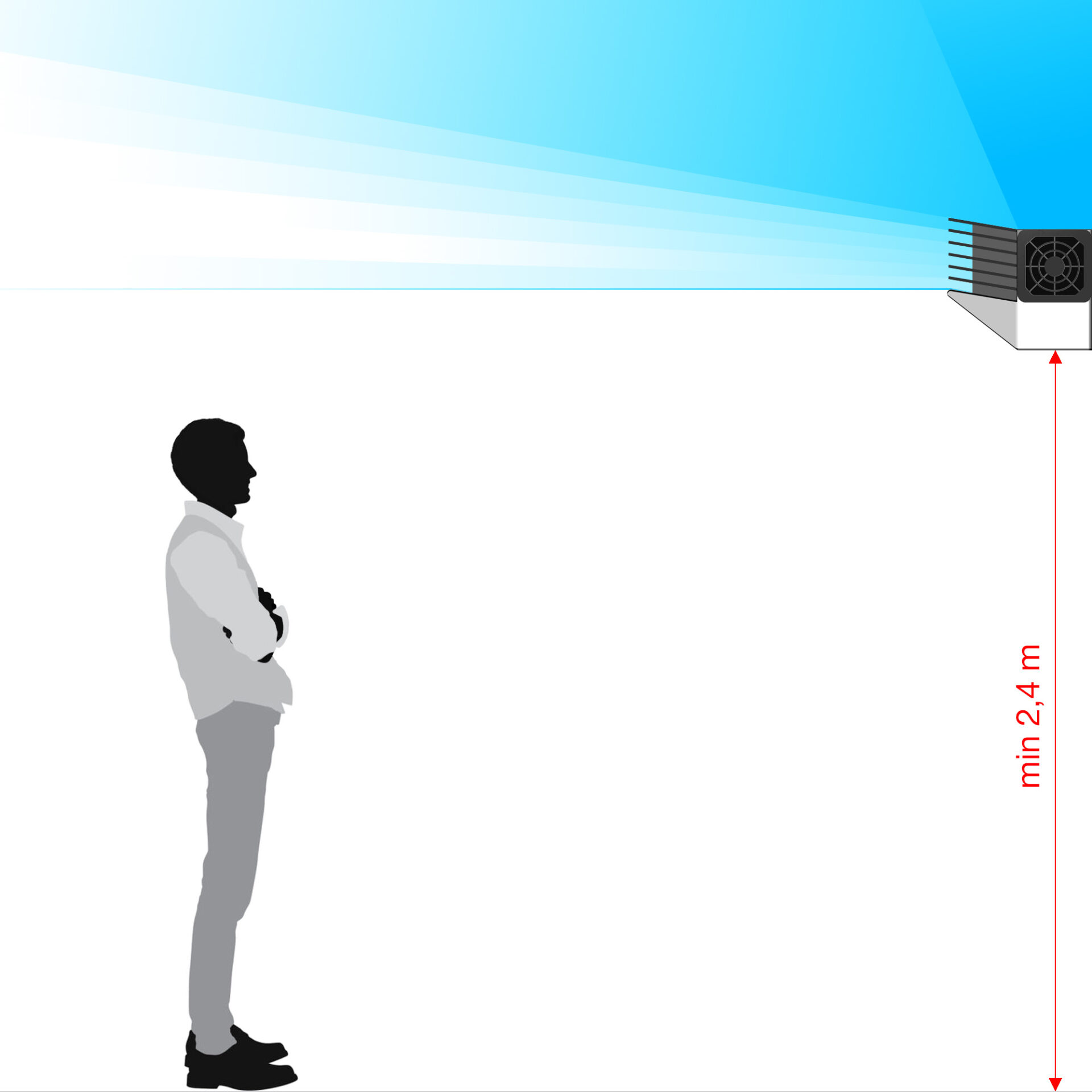 УВАГА! Опромінювач необхідно встановити на перпендикулярну підлозі площину (стіну) на висоті 2,4 метра від підлоги чи більше. Нижня площина корпусу опромінювача має бути під кутом 90° до стіни, тобто перпендикулярно їй та відповідно паралельно підлозі (рекомендується перевірити це, наприклад, будівельним кутником). Забороняється проводити роботи у верхній частині приміщення при працюючому опромінювачі, за необхідності перетину людиною лінії випромінювання – вимкнути опромінювач.